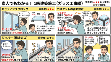 1級建築施工管理技士を目指す皆さん、お疲れ様です!この記事では、建具・ガラス工事における重要ポイントを中心に、「ひっかけ」キーワードの正しい知識やセッティング方法について詳しく解説します。どこにでも出てくる重要項目を見逃さず、しっかりと理解していきま […]