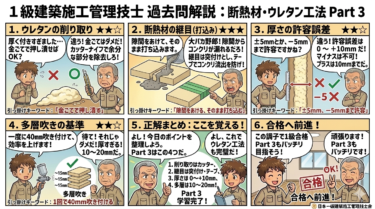 みなさん、こんにちは!この記事では、「断熱工事」に関する1次検定の頻出キーワードを解説し、類似問題に対する対策を紹介します。1級建築施工管理技士保有者の私が、実務経験を踏まえて重要なポイントを分かりやすく説明します。厚く付きすぎた部分の処理から断熱材 […]