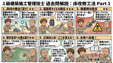 こんにちは!本記事では、1級建築施工管理技士の資格を目指す皆さんにお届けする解説記事です。今回は、1次検定で頻出のキーワード「ACL・ECP」に焦点を当て、一緒にポイントを確認していきましょう。床の撤去から下地調整まで、重要なポイントを網羅して解説し […]