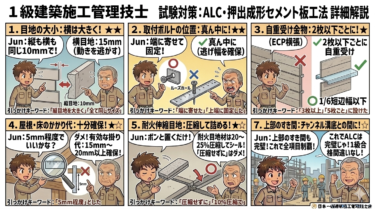 プロの建築施工管理技士を目指す皆さんへ、お役立ち情報をお届けします!「1級建築施工管理技士」の1次検定で頻出の「クロス・内装仕上げ」に焦点を当て、キーワードの解説や類似問題の対策について紹介します。この記事では、経験豊富な1級建築施工管理技士が、正し […]