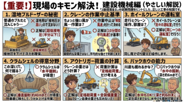 こんにちは!今回は、1級建築施工管理技士の1次検定「建築機械」の頻出キーワードを解説していきます。建設機械に関する知識は、試験合格だけでなく、実務においても非常に重要です。この記事では、私自身が1級建築施工管理技士を保有する経験を活かし、湿地ブルドー […]